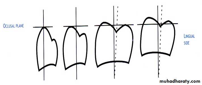 Occlusal: Buccal cusps are higher than Lingual cusps. Distal cusps are higher than Mesial cusps.