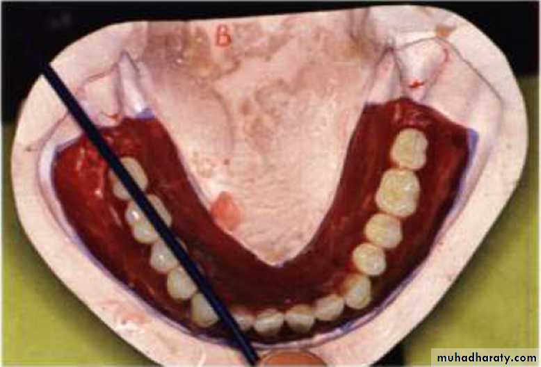 From tip of Canine to center of Retromolar pad. This designates centre of mandibular Ridge.Central fossae of mandibular Posterior teeth should coincide with this line OR