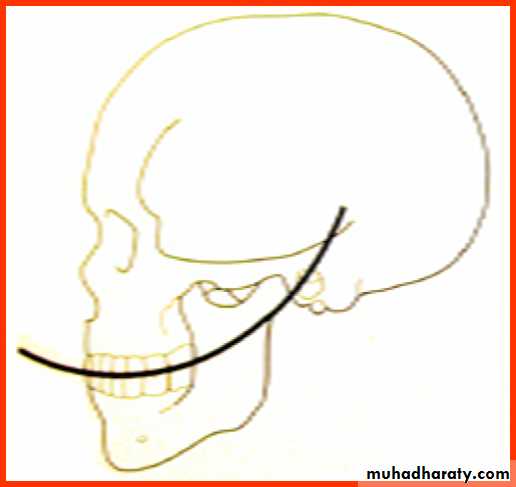 beginning with the cusp tip of the mandibular canine and following the buccal cusp tips of the premolar and molar teeth, continuing through the anterior border of mandibular ramus, ending with the anterior most portion of the mandibular condyle.contacts buccal and lingual cusp tips of molars on each side of arch
