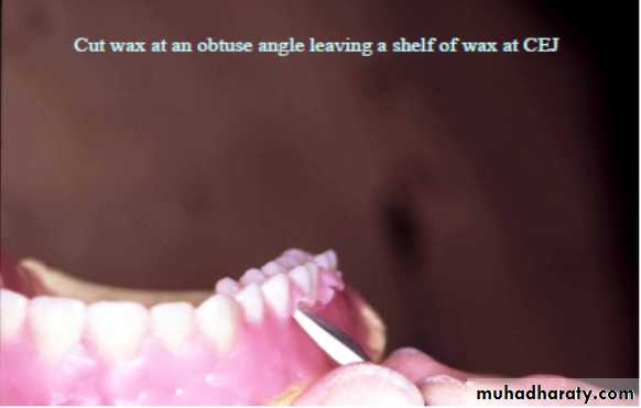 • Develop the margin by the carving with an Ash No. 5 or lacron carver at 45º angle to the neck of the teeth. The posterior area should have a marked fullness.