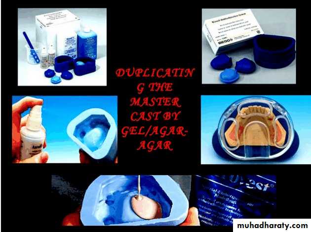 For duplication procedure a duplicating colloid have been used, this material is agar which reversible hydrocolloid that are capable of being reused up to four times, they may be prepared and stored in an automatic duplicating machine. A double boiler can be used to prepare the colloid for duplication. The clean colloid can be used by cutting it into small pieces, reheated in this double boiler to a fluid consistency, then tempered to a working temperature, it will be cooled enough to flow easily without melting the blocked out wax (63°C).