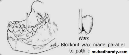 • Such areas are the labial surfaces and labial undercuts not involved in the denture design and the sublingual and distolingual areas beyond the limits of the denture design. These are blocked out arbitrarily with hard baseplate wax, but because they have no relation to the path of placement, they do not require the use of the surveyor.2/21/2017