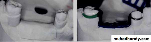 • On buccal and lingual surfaces, to locate the wax patterns for clasp arms• Wax ledge for reciprocal clasp arm as cervical as possible also ledge for location of retentive clasp arm, ledge is applied below the survey line around the abutment teeth. Wax ledges on buccal surfaces of premolar and molar abutments have been duplicated in refractory the cast for exact placement of clasp molar pattern and the premolar wrought wire clasp.