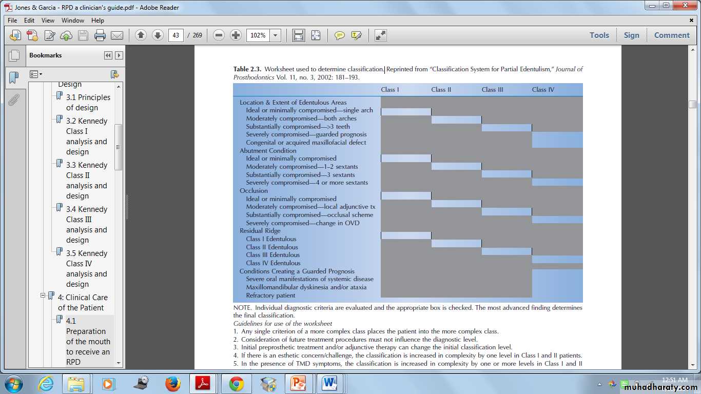 Individual diagnostic criteria are evaluated and the appropriate box is checked. The most advanced finding determines the final classificationClassification System for Partial Edentulism, Journal of Prosthodontics Vol. 11, no. 3, 2002: 181 – 193.