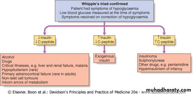 Note: Hypoglycaemia + high insulin + high C-peptide concentrations = insulinoma or sulphonylurea ingestion
