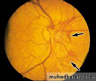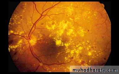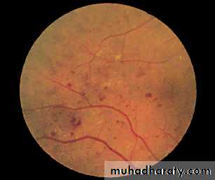 Venous dilatationPeripheral Microaneurysms (dots) haemorrhages (Blots) Exudates