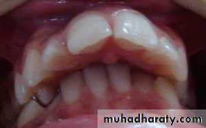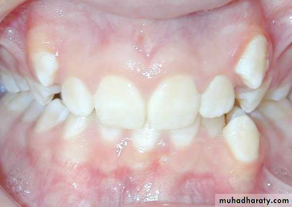 In more sever cases both upper central and lateral incisors are retroclined and overlapped by canines.