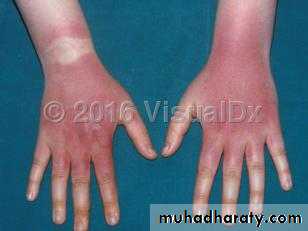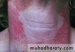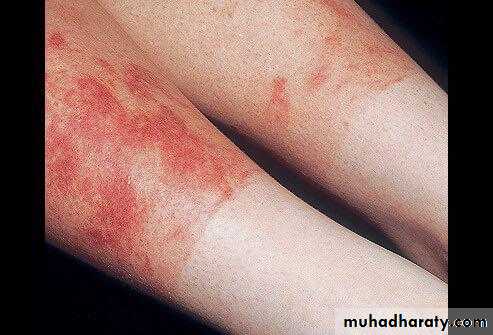 Eczematous type : Erythema, papules, scale, and sometimes vesicles occur. It occurs almost exclusively in men.Erythema multiforme-like type.