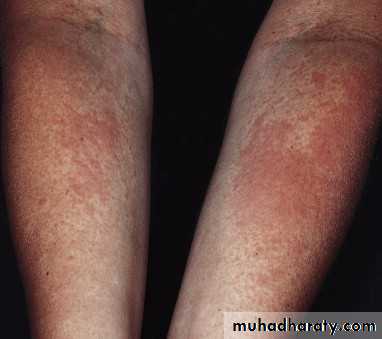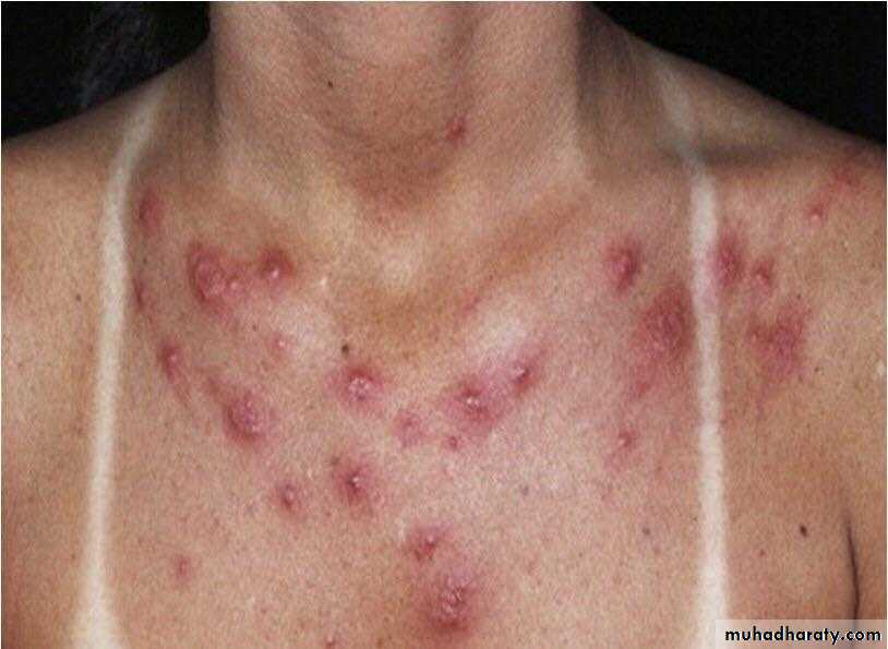 The papular type is the most common form. Small papules are disseminated or densely aggregated on a patchy erythema.Plaque type Is the second most common pattern.