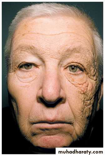 - elastosis (a coarsening and yellow discoloration of the skin)irregular pigmentation