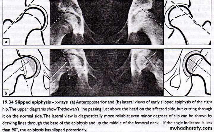 3 – in lateral view the femoral epiphysis is tilted back ward and this can be detected by measuring the angle between the axis of the femoral neck and the epiphyseal base , this normally 90* (right angle) , if it is less than 87* it mean the epiphysis is tilted posteriorly .