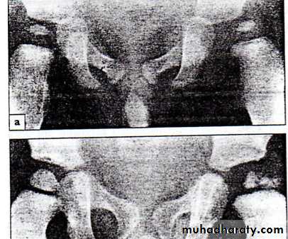 2 – in stage of arthritis in addition to rarefaction there is destruction of the acetabular roof (wondering acetabulum) ; or there is destruction of the femoral head or usually both and all these will lead to pathological dislocation and fibrous ankylosis .