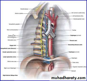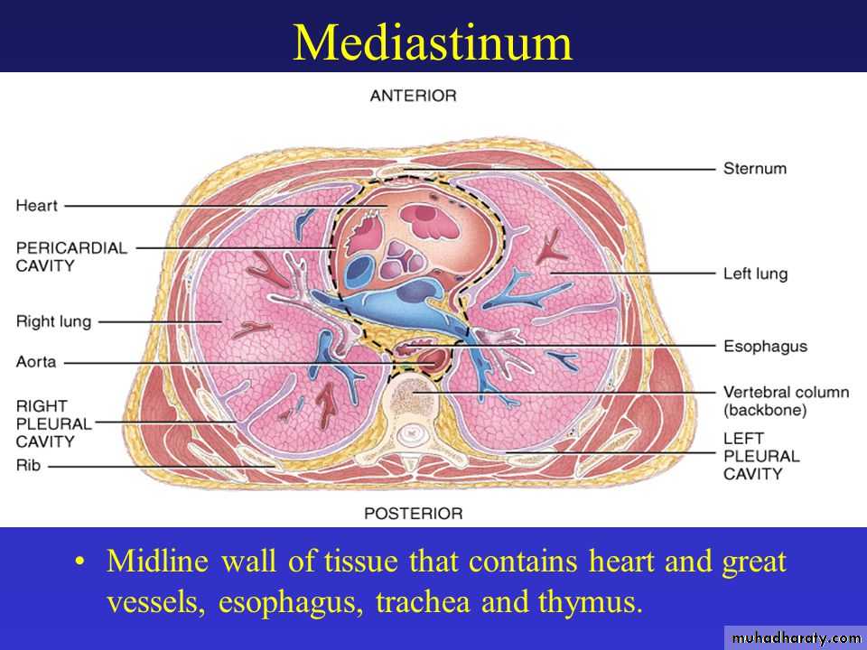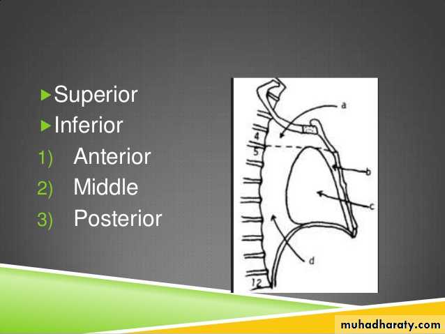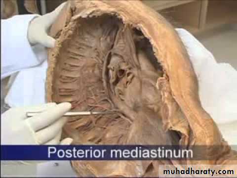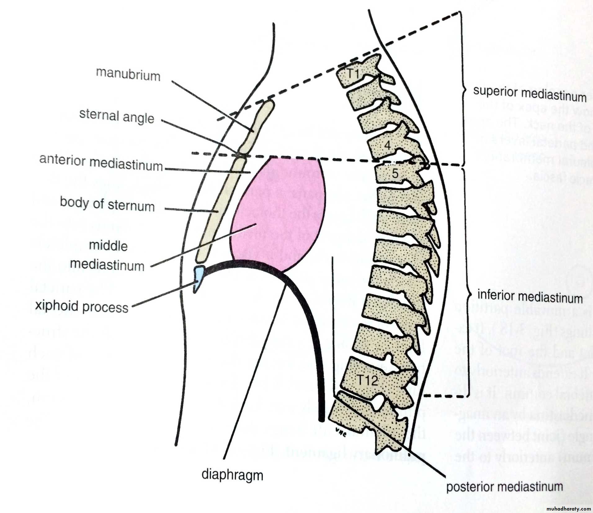 Mediastinum is subdived into 3 parts by the presence of the pericardium containing the heart ( This is middle one).The space infront of it (anterior one )& the part behind pericardium and infront of the lower 8 thoracic vertebrae (T5-T12)is the posterior mediastinum .