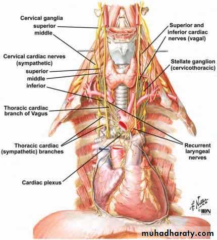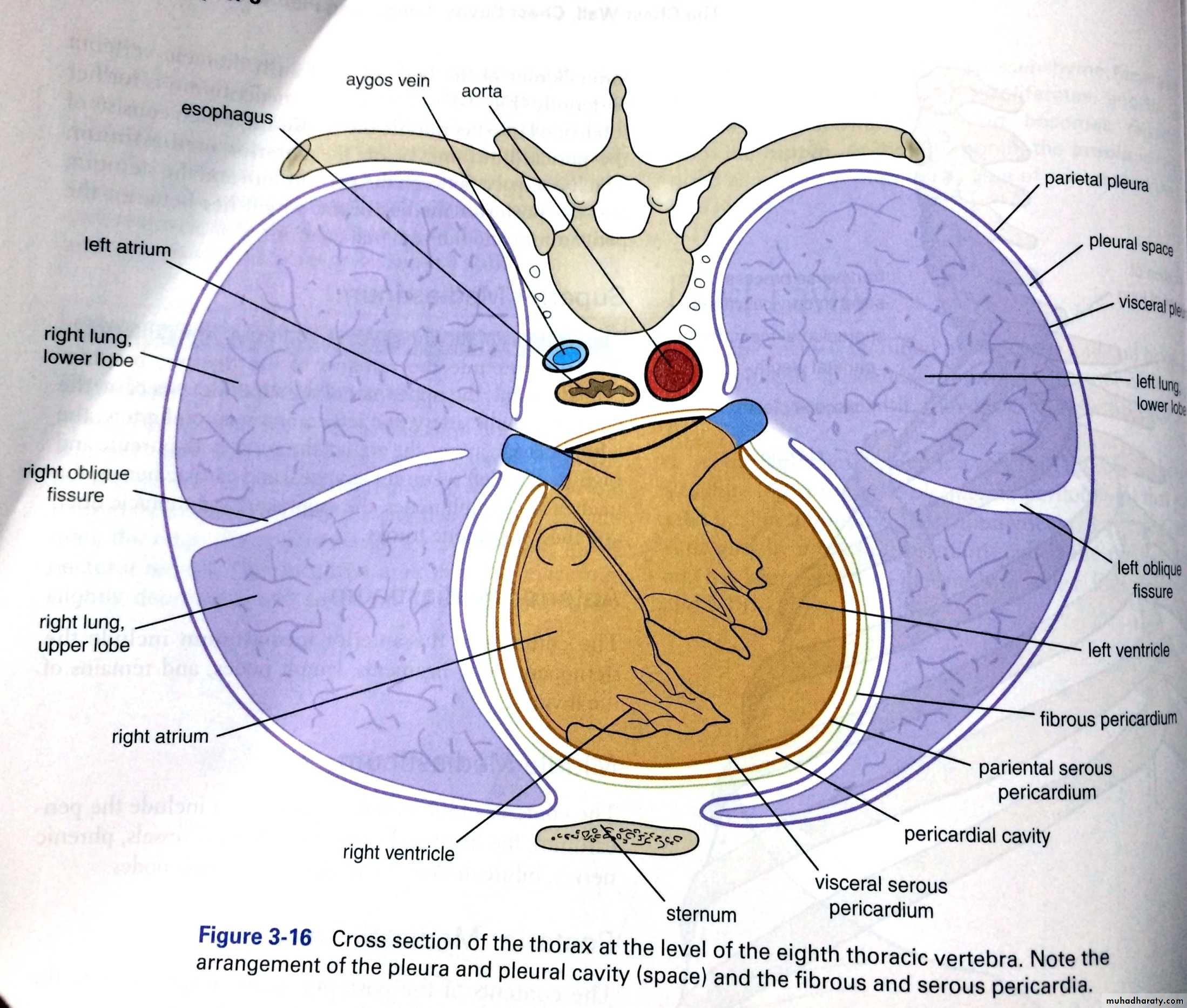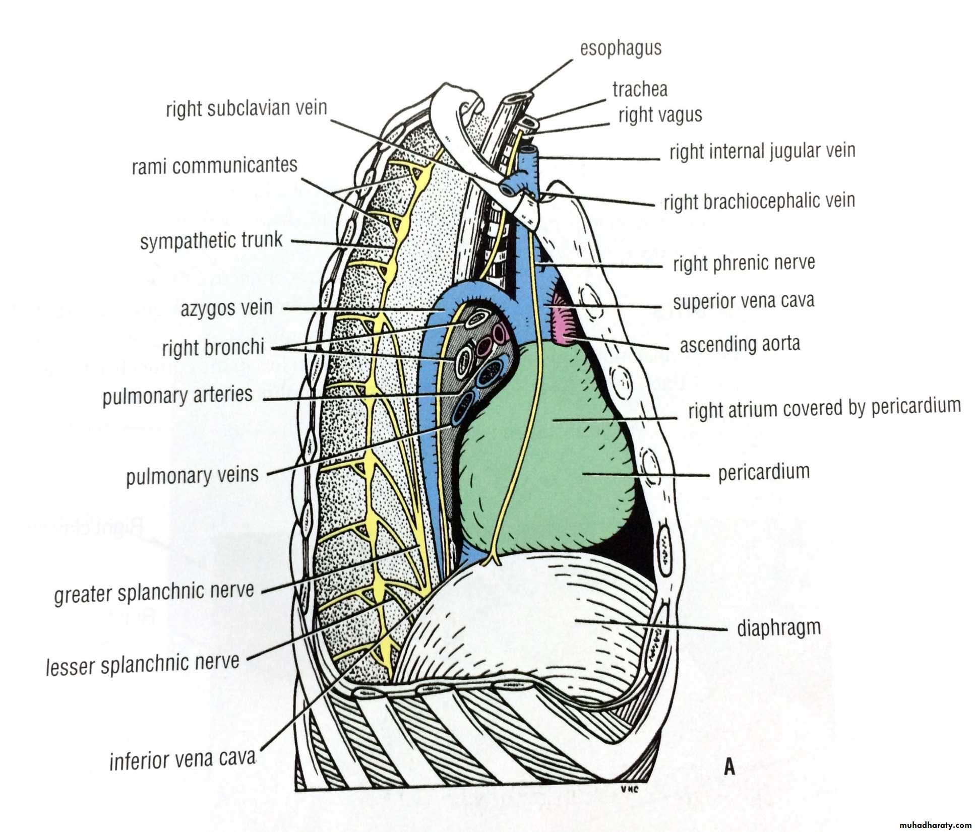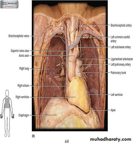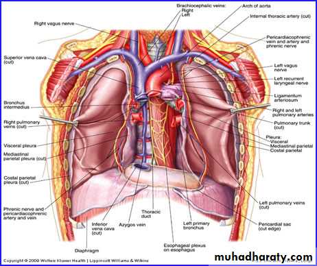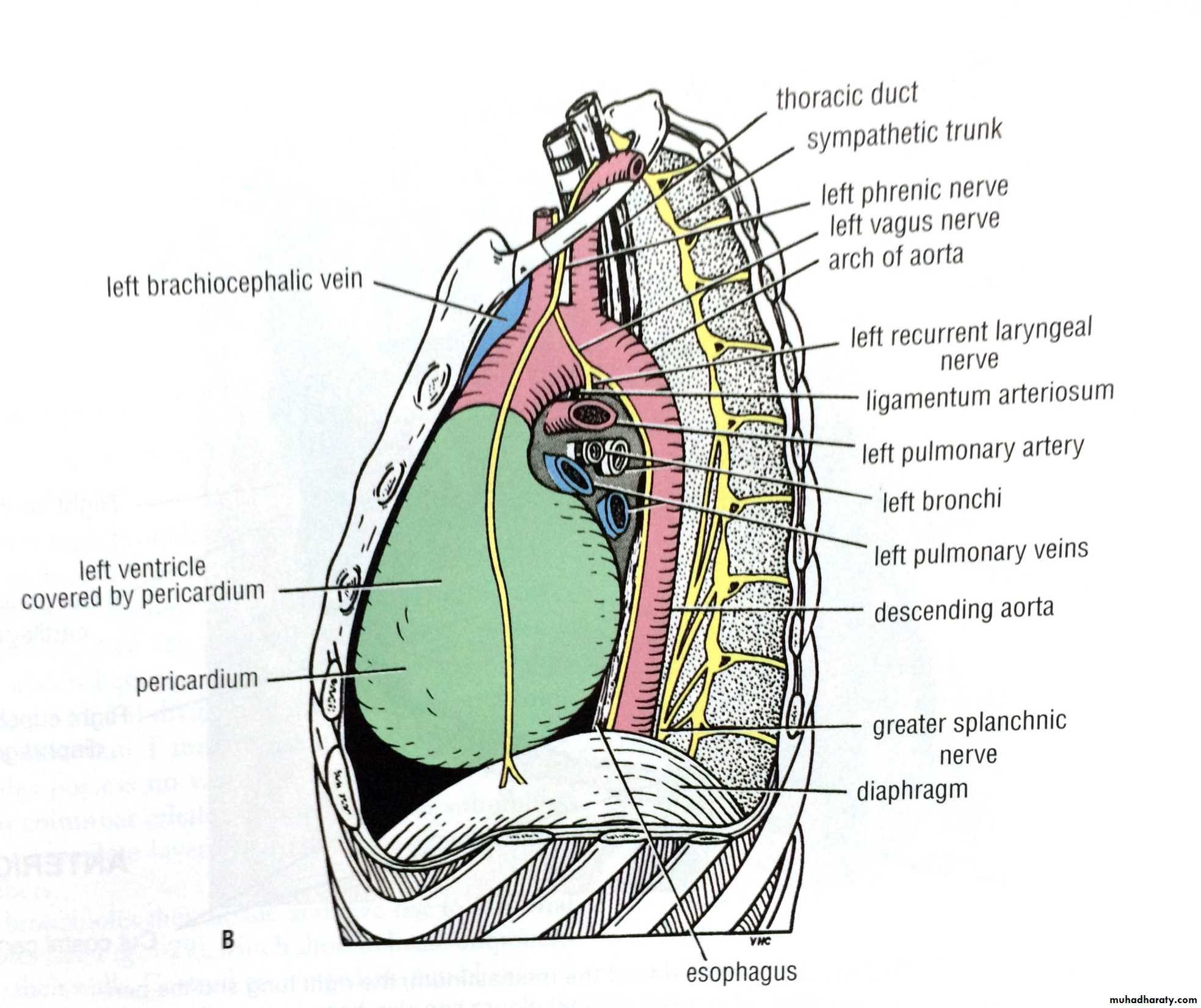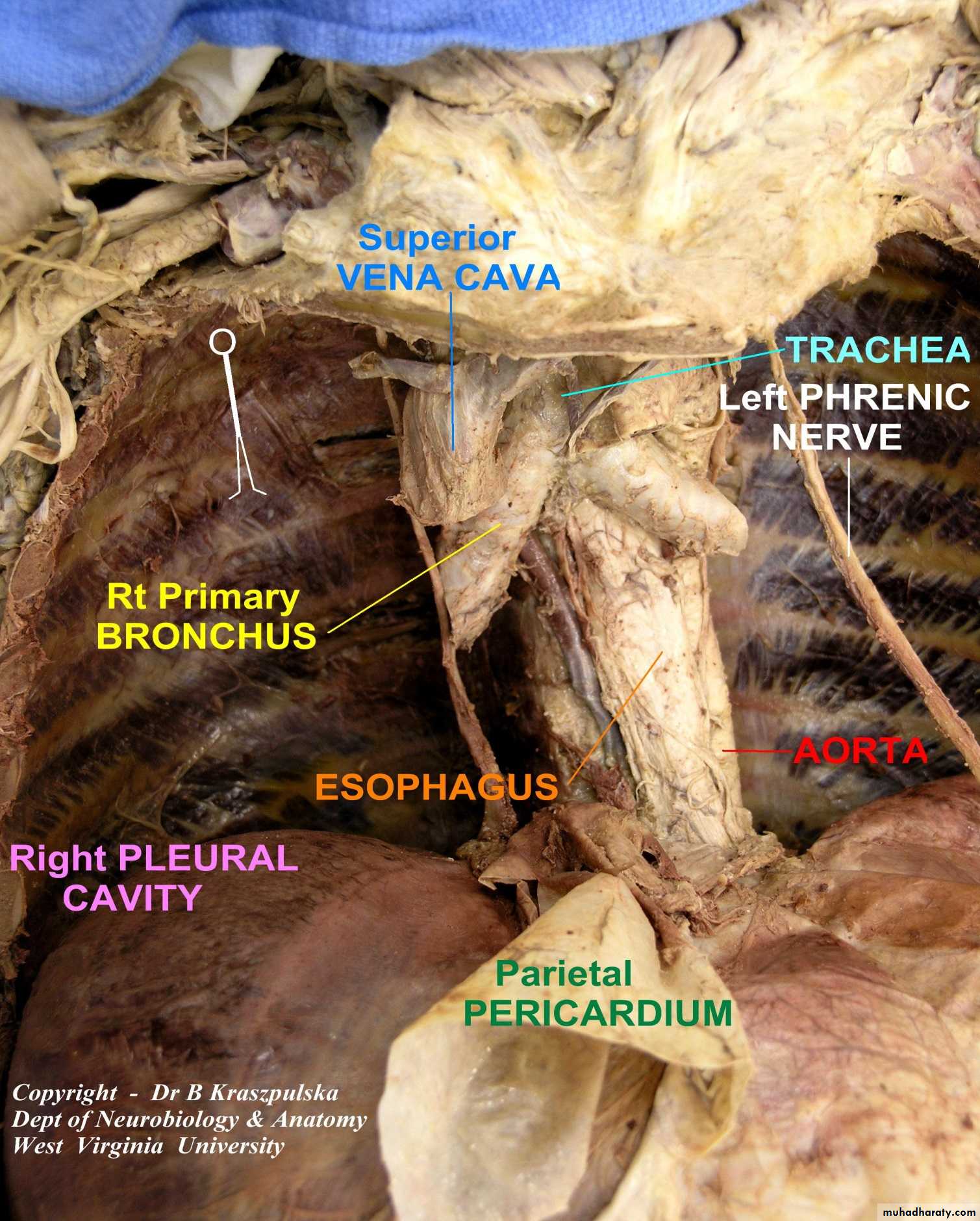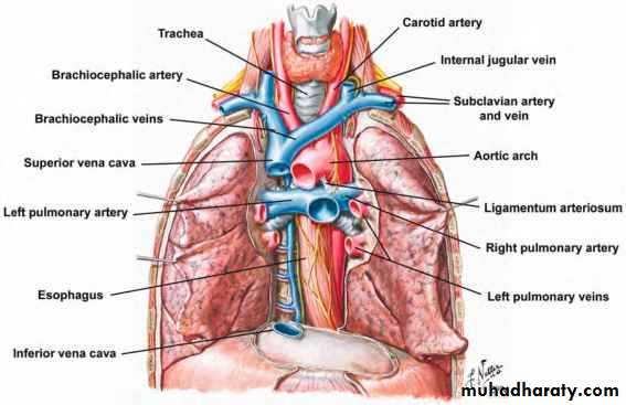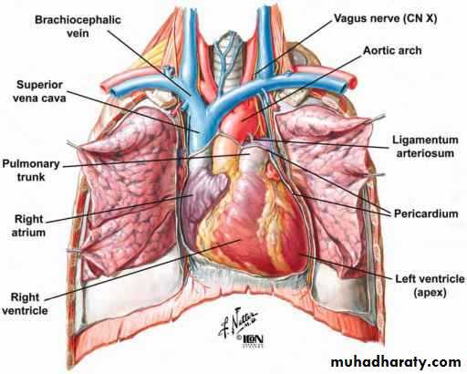 It contains the following structures:1-The Pericardium containing the Heart inside it.