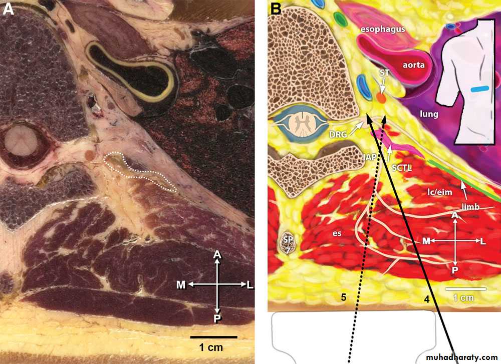 Between the sternal angle (anteriorly ) and the intervertebral disc between 4th thoracic vertebra( T 4 ) & the 5th thoracic vertebra (T5).