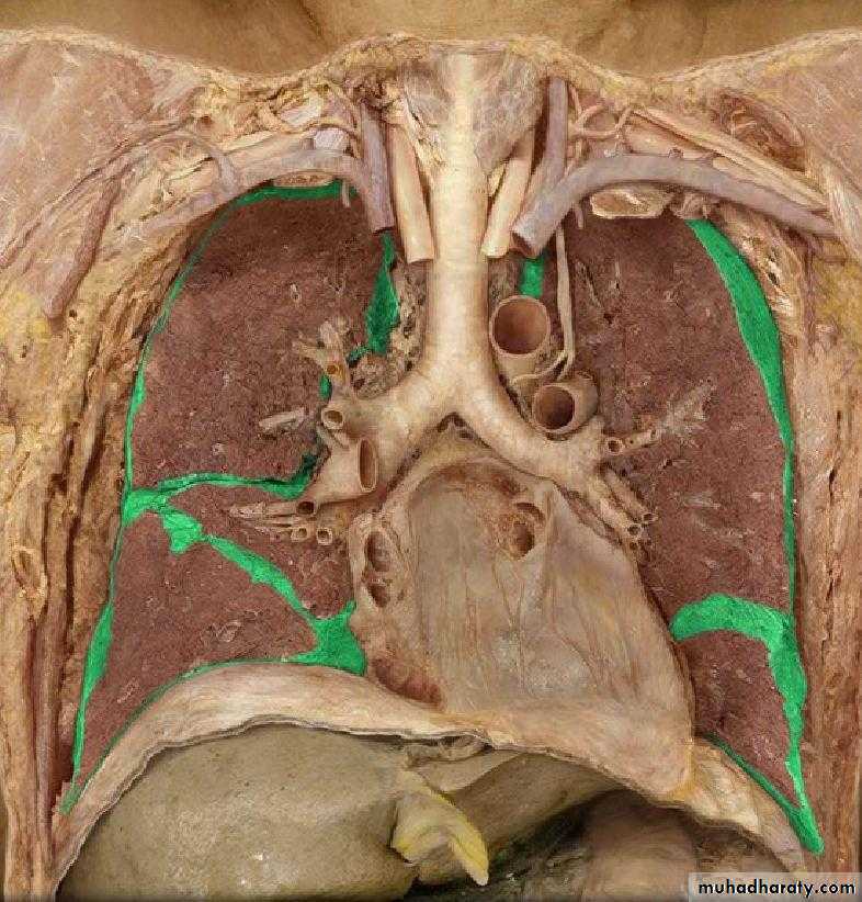 This space is enclosed between the medial surface of the 2 lungs (on each side ), middle part of the inlet of the thorax ( above ) and