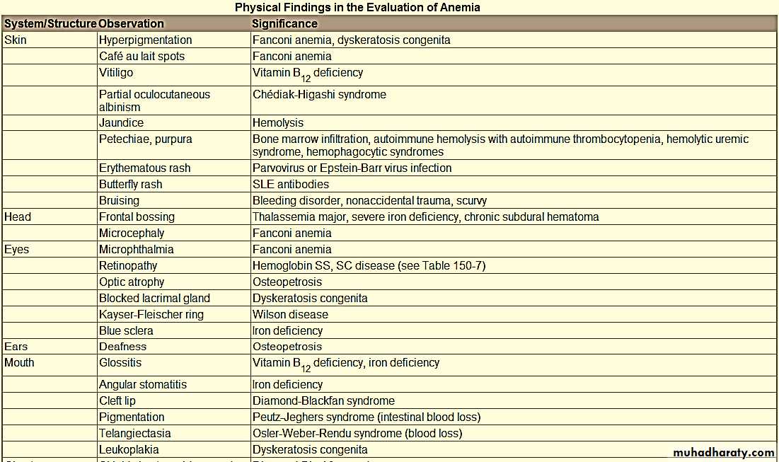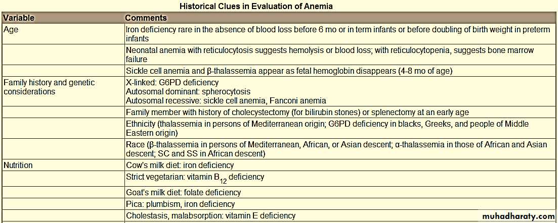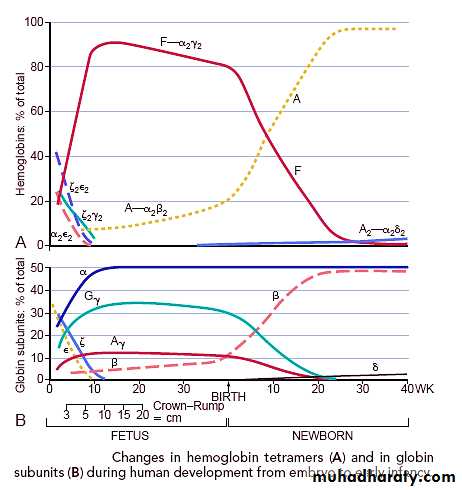 • Hemoglobin level and hematocrit are relatively high in the newborn; these values subsequently decline, reaching a nadir (7-9g/dl) at approximately 7 weeks of age for the premature infant and at 2 to 3 months of age for the term infant (10g/dl). (This condition is referred to as the “physiologic anemia” of infancy). Total hemoglobin concentration and hematocrit rise gradually during childhood .