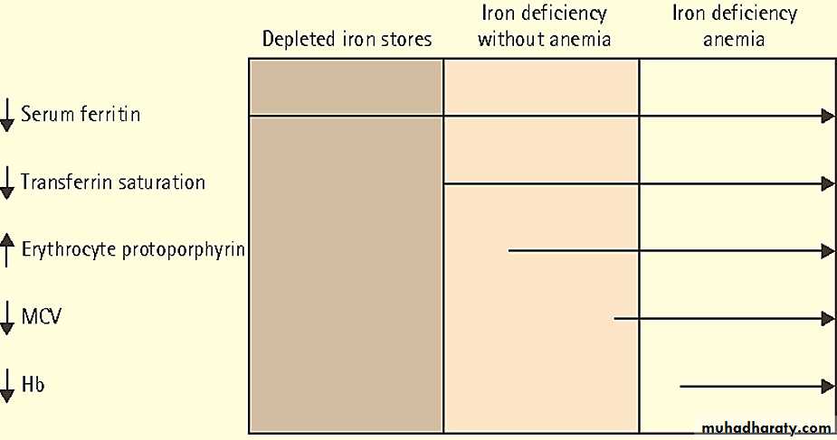 Iron deficiency causes serial changes in the blood before anemia develops.