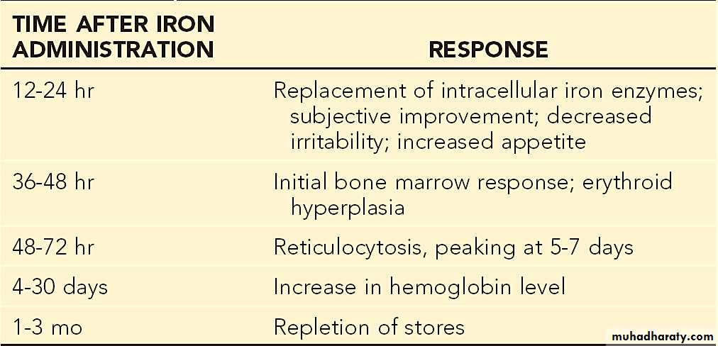 Therapy is continued for a period of 2 to 3 months after the hemoglobin level has returned to normal; this allows replenishment of tissue iron stores.