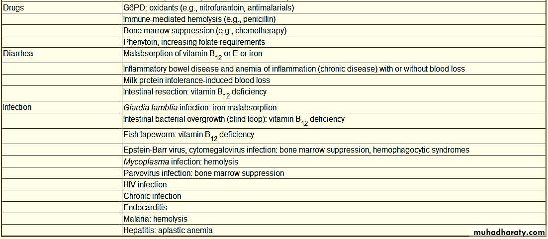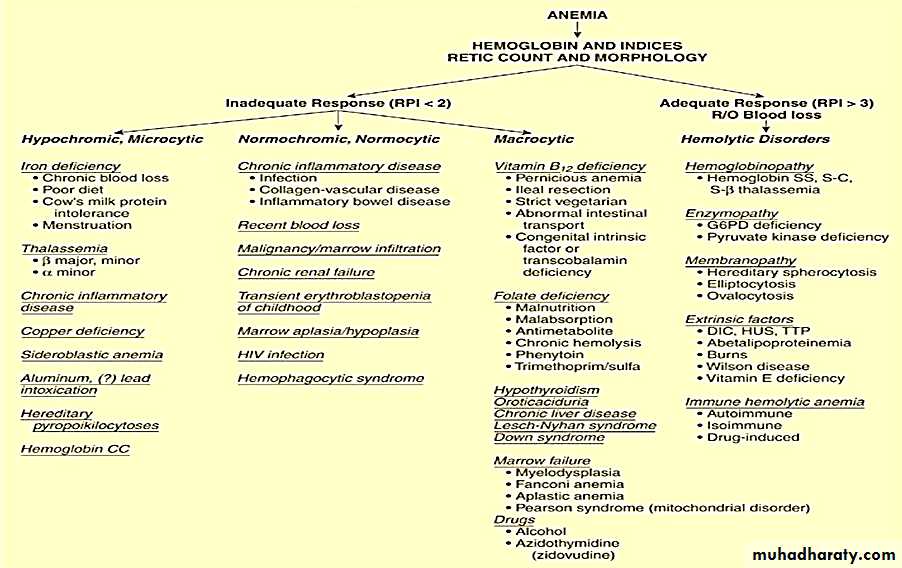ACCORDING TO ETIOLOGY• Inadequate RBC production; as due to IDA or folic acid defeciency or vit. B12 deficiency or bone marrow depression as aplastic anemia.