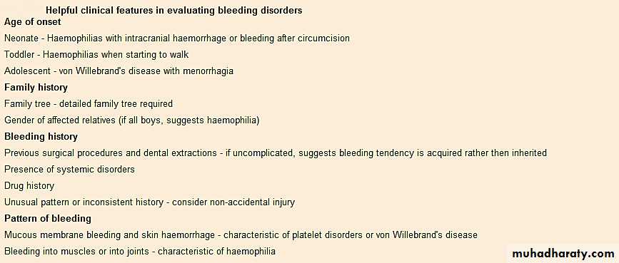 The diagnostic evaluation of an infant or child for a possible bleeding disorder includes:• Identifying the clinical presentation that suggest the underlying diagnosis.
