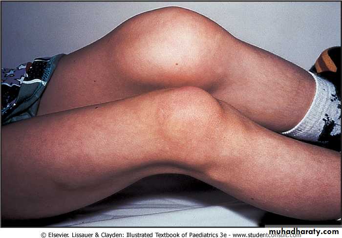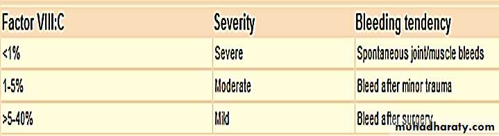 The disorder is graded as severe, moderate or mild depending on the FVIII:C (or IX:C in haemophilia B) level.The hallmark of the disease is recurrent spontaneous bleeding into joints and muscles, which can lead to crippling arthritis if not properly treated. Most children present towards the end of the first year of life, when they start to crawl then walk (and fall over).