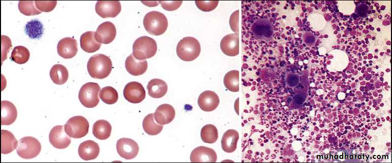 • Bone marrow aspirate (Increased numbers of megakaryocytes, many of which appear immature)A