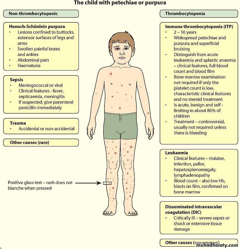 Most children present between the ages of 2 and 10 years, with onset often 1-2 weeks after a viral infection. Affected children develop petechiae and purpura and superficial bruising . It can cause epistaxis and other mucosal bleeding but profuse bleeding is uncommon. Intracranial bleeding is a serious but rare complication, occurring in 0.1-0.5%, mainly in those with a long period of severe thrombocytopenia.Significant adenopathy or hepatosplenomegaly is unusual, and the RBC & WBC counts are normal.