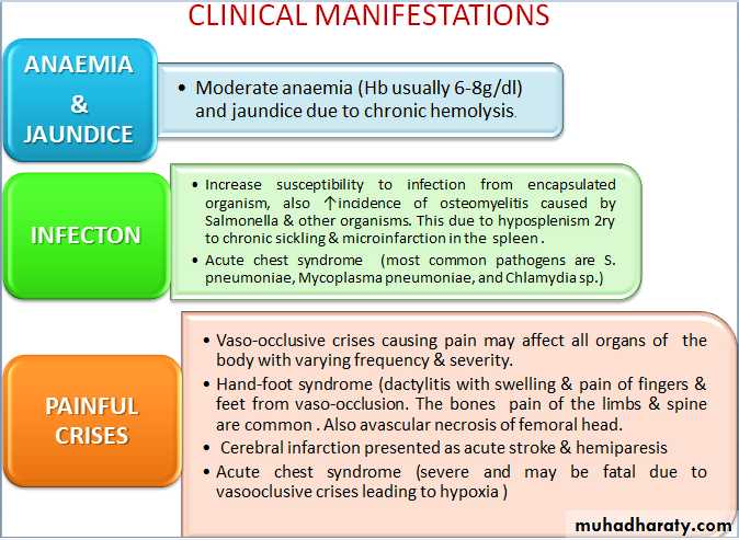 1-Sickle cell anaemia (HbSS) - patients are homozygous for HbS, i.e. virtually all their Hb is HbS; they have no HbA because they have no normal β-globin genes.2-SC disease (HbSC) - affected children inherit HbS from one parent and HbC from the other parent (HbC is formed as a result of a different point mutation in β-globin), so they also have no HbA because they have no normal β-globin genes.