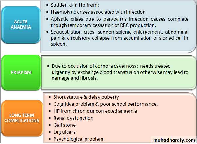 • Rare complications associated with HS include splenic sequestration crisis, gout, cardiomyopathy, leg ulcers, and spinocerebellar degeneration.