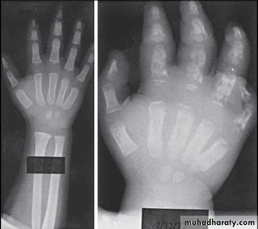 • The bones appear normal at the onset of the episode.• Destructive changes and periosteal reaction are evident 2 wk later.