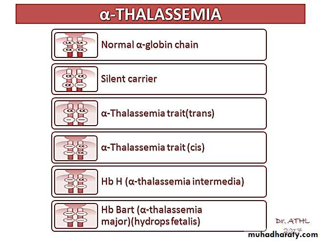 • Thalassemia is hereditary hemolytic anemia characterized by decreased or absent synthesis of one or more globin subunits of the hemoglobin molecule.α-Thalassemia results from reduced synthesis of α-globin chains.