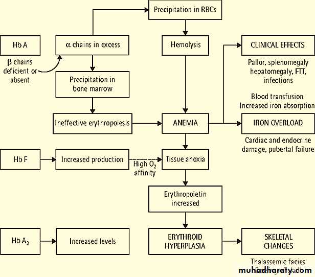 • Hemochromatosis: Even in the untransfused state, iron overload develops in thalassemic patients because of hyper absorption of dietary iron. The iron load becomes even greater with chronic transfusion therapy. When the bone marrow storage capacity for iron is exceeded, iron accumulates in parenchymal organs such as the liver, heart, pancreas, gonads, and skin, producing the complications of hemochromatosis. Many patients develop congestive heart failure, hypogonadism, DM, hypothyroidism, liver cirrhosis and short stature.