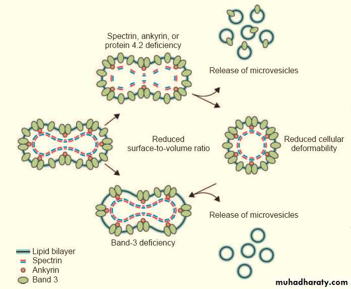 Molecular defect in protein spectrin, ankyrin or other proteins that are provide stability of RBC membrane shape. This results in the red cell losing part of its membrane, this reduction in its surface-to-volume ratio causes the cells to become spheroidal, making them less deformable than normal red blood cells and leads to their destruction in the microvasculature of the spleen.