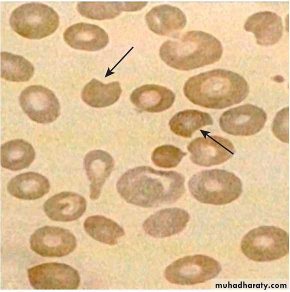 • Blood film: The RBC morphology during episodes of acute hemolysis is striking, appearing to have “bites” taken out of them (cookie cells). These are areas of absent hemoglobin that are produced by phagocytosis of Heinz bodies by splenic macrophages. When a patient with G6PD is exposed to significant oxidant stress, hemoglobin is oxidized, forming precipitates of hemoglobin called (Heinz bodies)