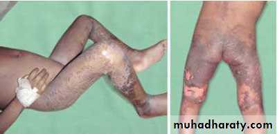 • a ‘flaky-paint’ skin rash with hyperkeratosis (thickened skin) and desquamation