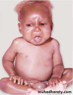 Kwashiorkor is another manifestation of severe protein malnutrition in which there is generalised oedema as well as severe wasting.Because of the oedema, the weight may not be as severely reduced. In addition, there may be: