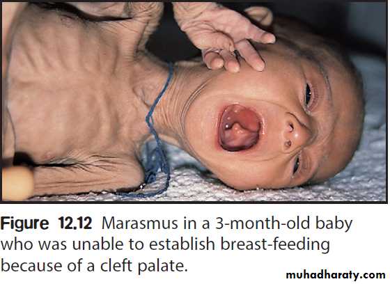 Severe protein-energy malnutrition in children usually leads to marasmus, with a weight for height more than −3 standard deviations below the median, corresponding to <70% weight for height, and a wasted, wizened appearance (Fig. 12.12). Oedema is not present. Skinfold thickness and mid-arm circumference are markedly reduced, and affected children are often withdrawn and apathetic