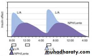 B/ L or A pre-meal; NPH or Lente at breakfast and bedtime. Moving the evening long-acting insulin helps to cover the pre-breakfast hours
