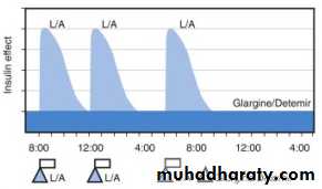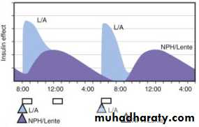 • The use of rapid acting insulin decrease the problem of between- meal insulin peaks when regular is used.