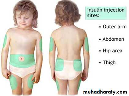 • The skin should be pinched up and the insulin injected better at a 45° angle in young child to avoid injection of insulin in muscle.