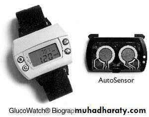 • Glucowatch Biographer also measure interstitial glucose through a patch of membrane applied on the forearm. It provides real time interstitial fluid glucose values