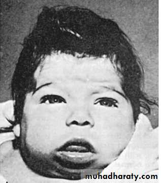 The mouth is kept open, and the thick, broad tongue protrudes. Dentition will be delayed.
