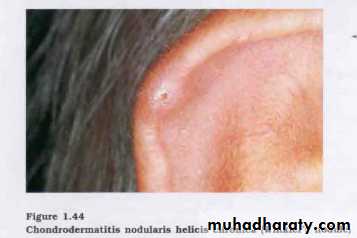 3. Chondrodermatitis nodularis chronica helicis ( Winkler's disease )Small painful nodules appear near the free border of helix in men about the age of 50 years. Nodules are tender and the patient is unable to sleep on the affected side. Treatment is wedge excision of the nodule with its skin and cartilage.
