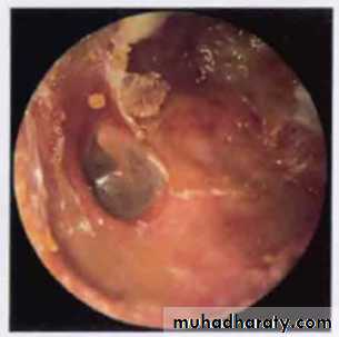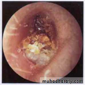 Collection of a pearly white mass of desquamated epithelial cells in the deep meatus . This, by its pressure effect, causes absorption of bone leading to widening of the meatus so much so that facial nerve may be exposed and paralysed.