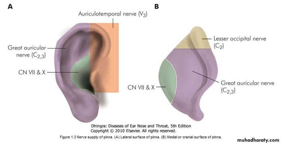 (i) Greater auricular nerve (C2,3) supplies most of the medial surface of pinna and only posterior part of the lateral surface .