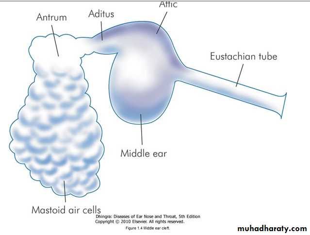 The middle ear together with the eustachian tube, aditus, antrum and mastoid air cells is called the middle ear cleft. It is lined by mucous membrane and filled with air.