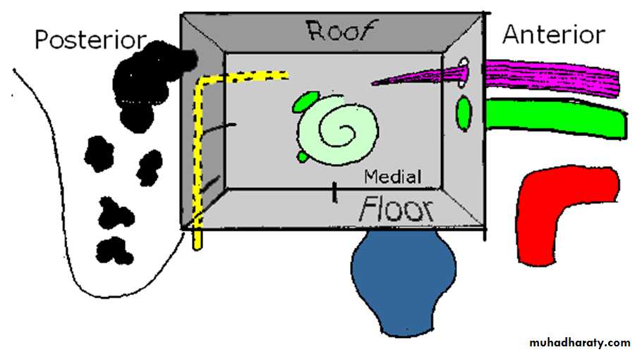 Middle ear can be likened to a six-sided box with a roof, a floor, medial, lateral, anterior and posterior walls .