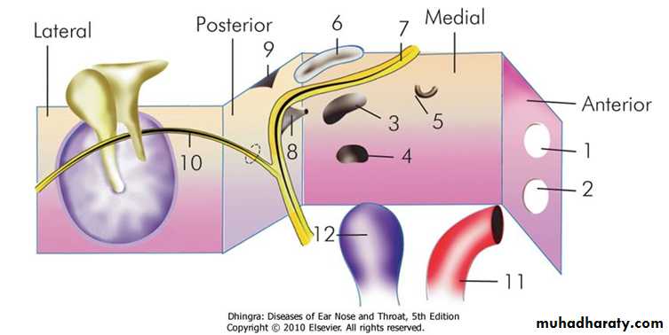 lies close to the mastoid air cells. It presents a bony projection called the pyramid through the summit of which appears the tendon of the stapedius muscle to get attachment to the neck of stapes. Aditus, an opening through which attic communicates with the antrum, lies above the pyramid. Facial nerve runs in the posterior wall just behind the pyramid.