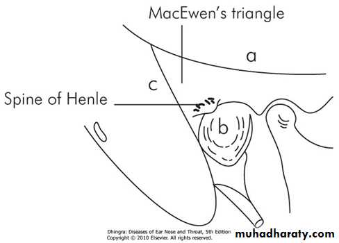 The lateral wall of antrum is formed by a plate of bone which is on an average 1.5 cm thick in the adult. It is marked externally on the surface of mastoid by suprameatal (MacEwen's) triangle .